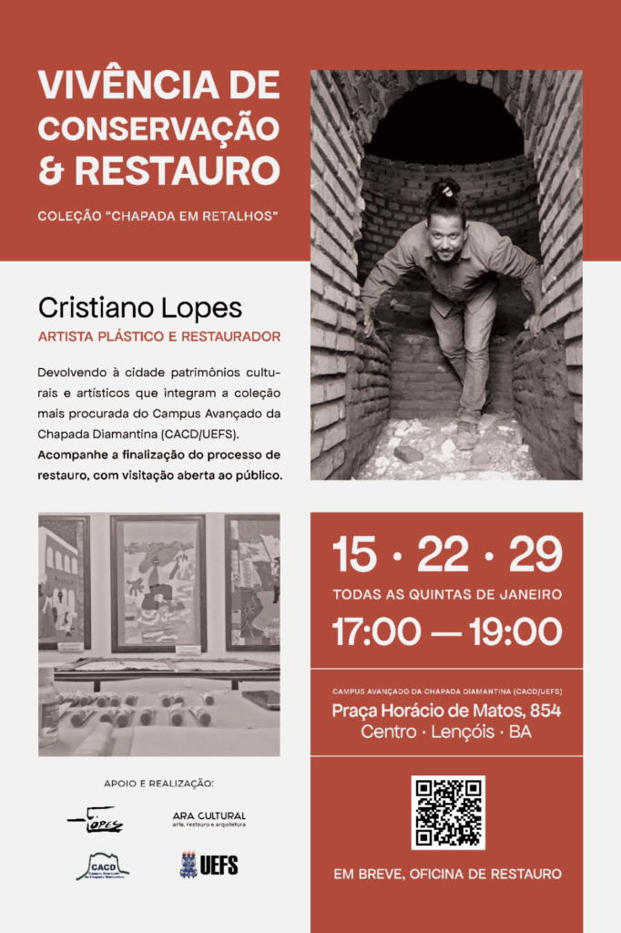 O Campus Avançado da Chapada Diamantina (CACD/UEFS), junto ao ARA Cultural, convida toda a comunidade interessada para a vivência de Conservação & Restauro da coleção Chapada em Retalhos, conduzida pelo artista plástico e restaurador Cristiano Lopes.